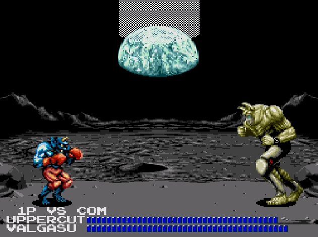 Ao jogar sozinho, a dificuldade aumenta pela apelação dos adversários, que vão emendar agarrões quase em looping quando der na telha (coisa que você dificilmente consegue fazer), tipo você cai, ele já te agarra e joga de novo, etc. O inimigo final, Valgasu, é bem maior que os outros e arranca quantidades cavalares de energia com seus tapões e bicudas, mas a forma de lutar não muda; você vai fazer tudo igual do começo ao fim: golpe, paralisa, agarra, arremessa. Não tem magia, não tem especial, não tem graça, um tédio absoluto. Ainda bem que o game é curto (12 lutas, um round cada).