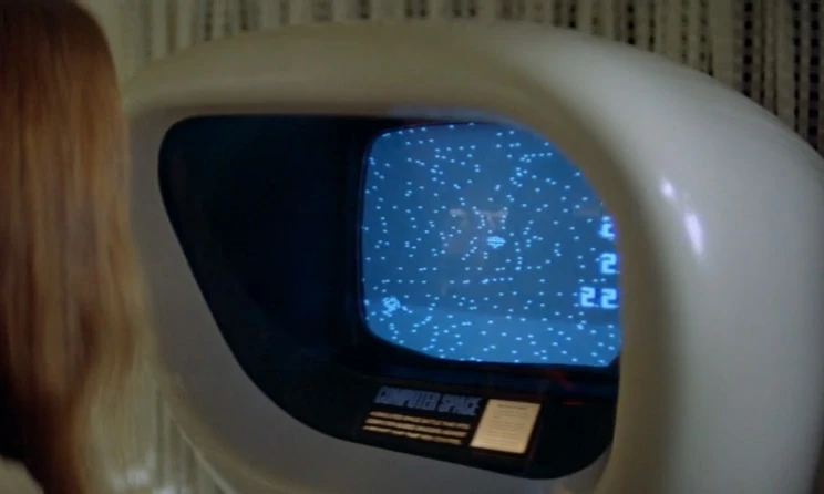 Note que com quase 40 anos entre o filme e os eventos, um arcade já foi colocado ali como representação de algo futurista. Pena que assistindo hoje não faz tanto sentido, já que se trata de uma máquina de Computer Space, o primeiro arcade comercial da história, lançado em 1971.