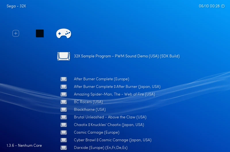 O usuário escolhe qual core quer, baixando pela interface do programa. Vamos pegar como exemplo o 32X da Sega. No menu principal, selecione Add Content, e depois Baixar Conteúdo. Selecione o que faz a emulação do sistema desejado e tecle X.